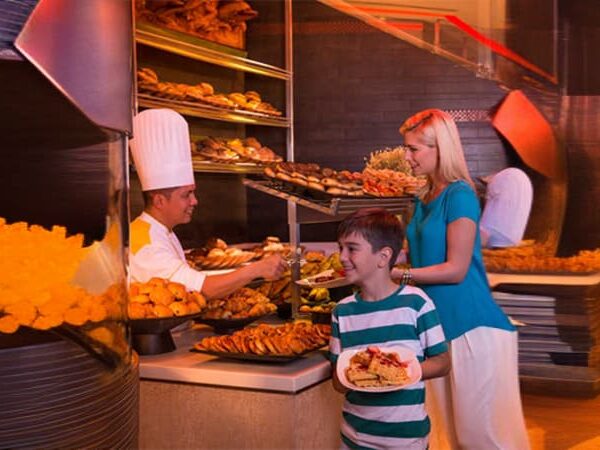 Dining Experience: Relish a diverse buffet spread, featuring dishes from various international cuisines, in a luxurious setting.
